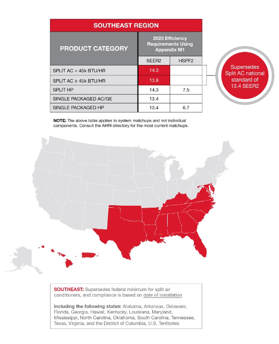 Navigating Regional Standards The 2023 requirements apply nationally—unless superseded by a regional standard. The regional standards apply in the Southeast and the Southwest, and there is a key difference between the national and regional standards when it comes to enforcement. While both had a compliance deadline of January 1, 2023, the national deadline is based on the equipment date of manufacture, while compliance to the regional standards is based on the date of installation. Heat pumps do not have regional efficiency criteria, so the national criteria apply in all states.